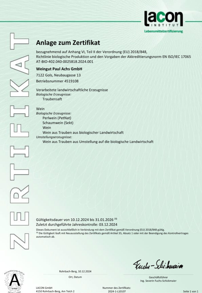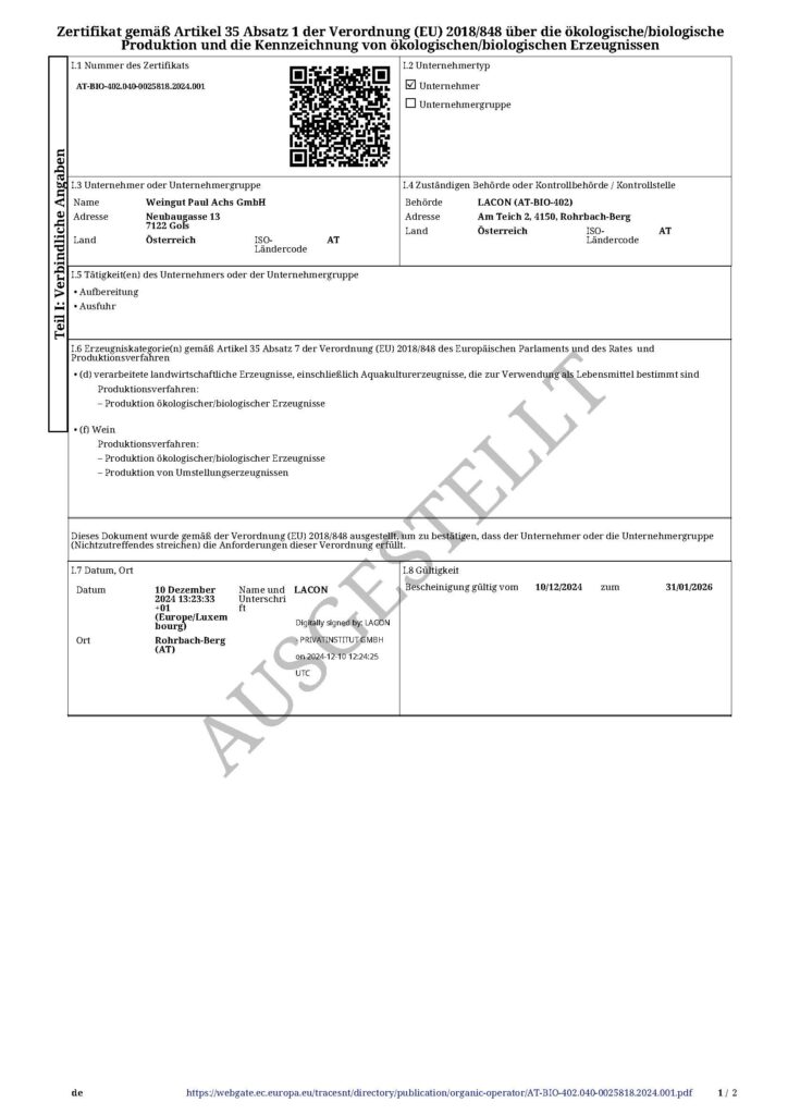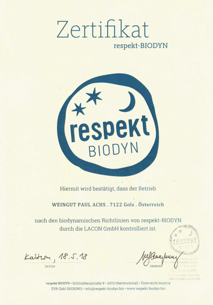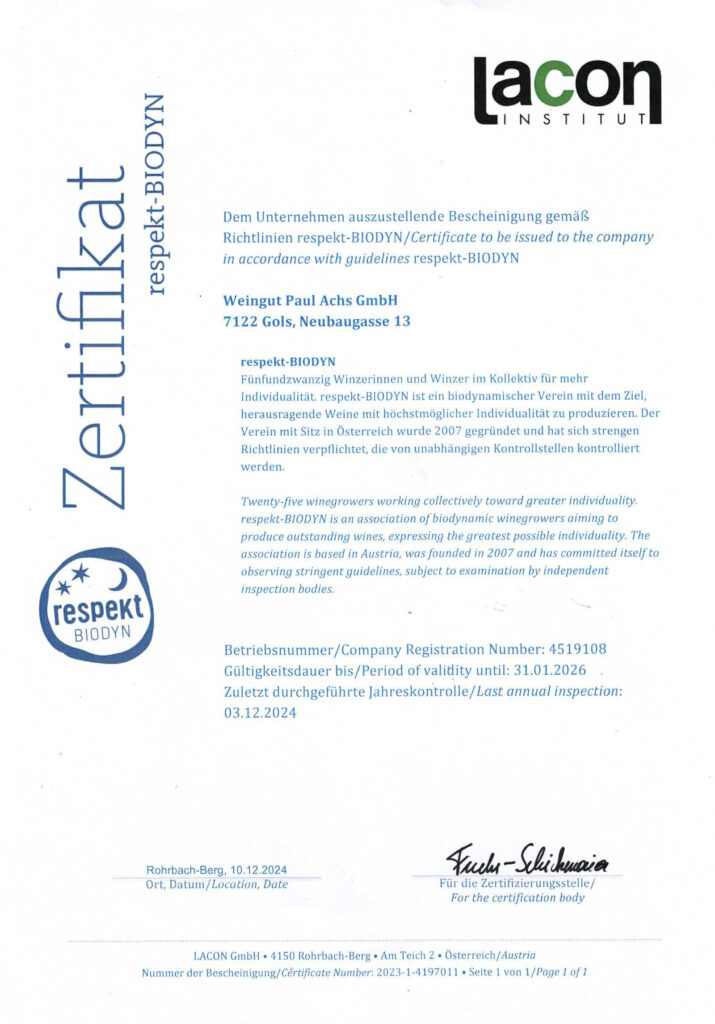 Hier finden Sie unsere aktuellen Bio- und Qualitätszertifikate zum Herunterladen. Sie dokumentieren unser Arbeiten nach biodynamischen Richtlinien und geben Ihnen die Sicherheit, dass unsere Weine so entstehen, wie wir es versprechen – mit Respekt vor Natur, Boden und Herkunft.